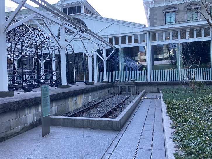 都電6系統の始点となる電停は何回か変更されています。昭和四十二年の廃止時には新橋(現在の新橋交差点辺り?)だったのですが、昭和三十年代にはひとつ手前の汐留だったみたいです。汐留駅は旧国鉄の駅でしたが、その周辺に電停があったと思われます。明治五年(1872年)に日本初の鉄道が横浜との間に開設された際、起点となる新橋駅が汐留に建設されました。しかし、大正三年(1914年)に東京駅が完成し、東海道本線の起点が東京駅に変更されたため、元の新橋駅は汐留駅に改称し、貨物専用駅に変更されました。貨物専用駅の近くに電停を設置しても利用者がいたのかと疑問に思いますが、そのあたりの事情はわかりませんので深追いしないことにします。ということで、現在は汐留シオサイトの中に展示・保存されている旧新橋停車場にやってきました。高層ビルの谷間に駅のホームが再現されています。