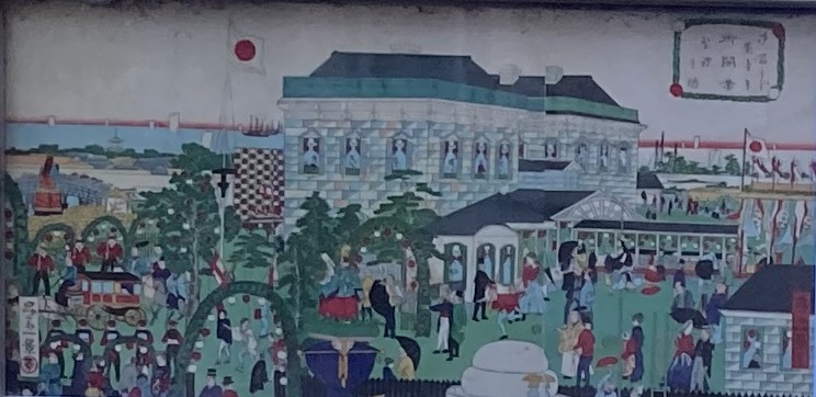 A colored woodblock print titled "the first railway in Japan at the former Shimbashi Terminal (Shiodome yori Jokisha-gokaigyo Sairei no Zu)" by Shosai Ikkei, 1872