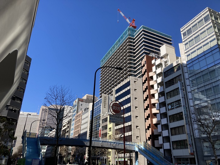 新橋交差点で外堀通りに入ります。恐らく、この辺りに新橋電停があったものと思われます。JRの高架を抜けた先にかって田村町がありました。現在では田村町という町名は存在しませんが、昭和四十年(1965年)の住居表示実施の際に、港区はそれまでの芝田村町を中心とする区域を田村町とせず、新橋の西側に位置することから西新橋と命名しました。ただ、現在でも田村町という名前は地域に根付いているみたいです。西新橋近くに田村町再開発なる案内板が立っています。外堀通りから一歩入った奥に、巨大なビルが全容を現しています。日比谷フォートタワーというのだそうです。日比谷フォートタワーは、三井物産都市開発が参加組合員として参画する新橋田村町地区市街地再開発組合が東京都港区西新橋一丁目地内に新設する地上27階、地下2階、高さ138.4m、延べ面積105、633uの超高層ビルです。 2021年6月に竣工する予定なのだとか。