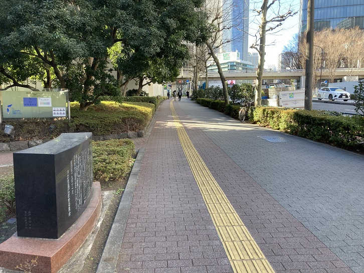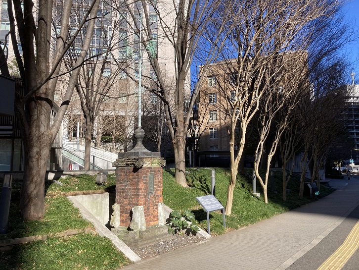 歩道の脇の植え込みに工部大学校跡のモニュメントが立っています。