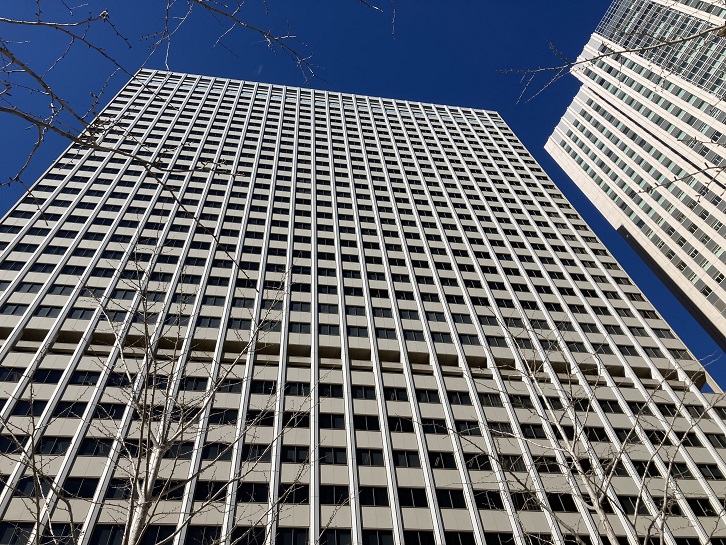 霞が関ビルは、地上36階・地下3階・地上高147mの日本最初の超高層ビルとして知られています。昭和四十三年(1968年)4月12日にオープンし、耐震設計として鋼材を組み上げた柔構造を採用しています。日本の超高層ビルの先駆けとなった建物です。2001年からの霞が関三丁目エリアの再開発「霞が関コモンゲート」にともなって、隣接する霞が関ビルでも低層部の増築や改装などが行われ、ビル単体に止まらず地域全体の付加価値の向上が図られています。外堀通りから一段高くなった高架広場はまるで地面のようです。