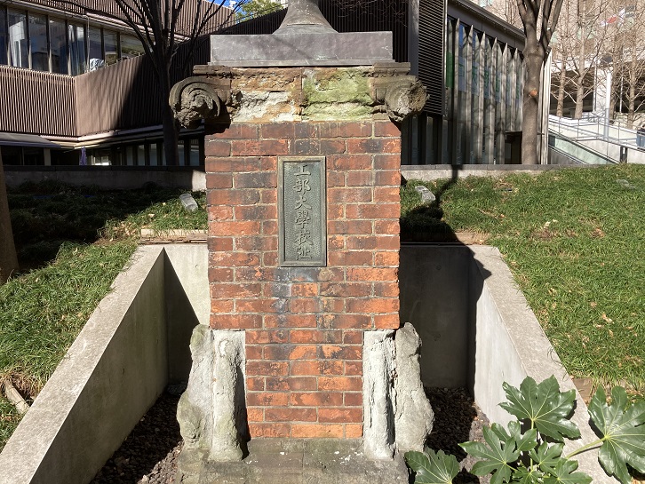 明治六年(1873年)、この地に工業分野における人材育成を目的とした工学校(工学寮内に設置)が開校します。明治十年(1877年)には、工学寮が工部大学校ど改称されました。工部大学校では、土木・機械・造家などの学科が諸外国から招聘された外国人教師によって教授されました。1886年に帝国大学と合併し、本郷(現在の文京区)に移転します。跡地は、帝室博物館などに使用されますが、大正十二年(1923年)の関東大震災で建物は倒壊してしまいました。そこで、工部大学校出身者たちは、倒壊した建造物の煉瓦などを利用して、昭和十四年(1939年)に「工部大学校阯碑」を建設しました。この碑は、日本最初の工業技術教育機関が設置された場所とともに、関東大震災による被災の歴史を伝えています。
