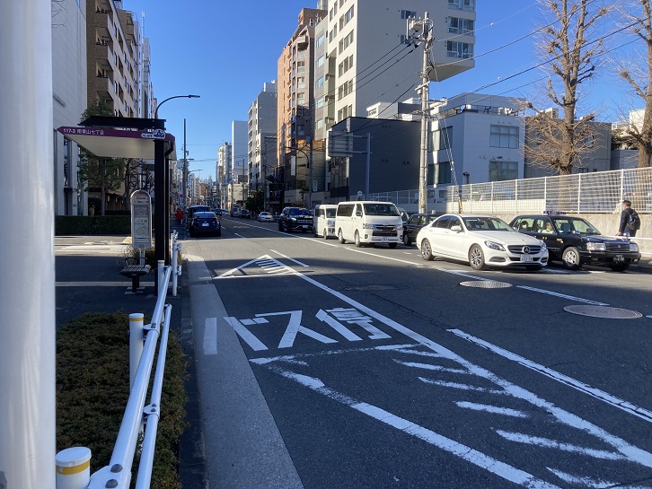 高樹町交差点を右折して骨董通りに入ります。骨董通りは正式には「南町通り」ですが、かつては「高樹町通り」と呼ばれ、アンティーク通りという表記も見られます。六本木通りと青山通りとを繋いでいますが、六本木通りに青山学院下のトンネル(青山トンネル)が開通する前には、渋谷と六本木を繋ぐ主要路としても機能していました。当時は都電も渋谷駅から青山通りを青山六丁目(現南青山五丁目交差点)で右折してこの道路を走っていました。