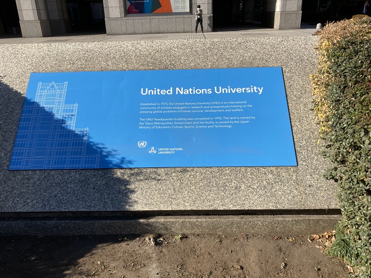 国連大学は1969年に当時の国際連合事務総長ウ・タントが構想を提案し、開発途上国を中心に支持を受け、1973年に国際連合大学憲章が国際連合総会で採択されて設立されました。青山に本部が置かれ、国連およびその加盟国が関心を寄せる緊急性の高い地球規模課題の解決に取り組むため、共同研究・教育・情報の普及・政策提言等を通じて寄与することを使命としています。国連システムおよび国連加盟国のシンクタンクとしての機能を持っています。現在国連大学が建つ場所は、青山通り沿いに隣接するこどもの城(既に閉館されています)やオーバルビルなどとともに、かつては都電の青山車庫でした。