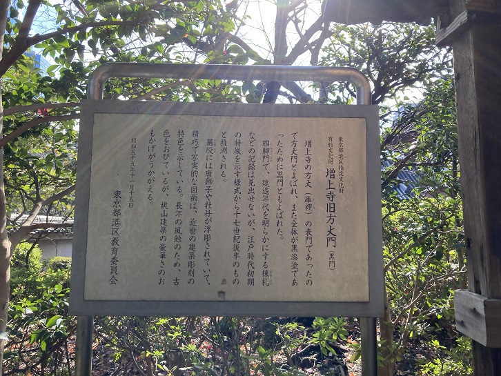 増上寺の方丈(庫裡)の表門であったので方丈門とよばれ、また全体が黒漆塗であったために黒門ともよばれた。四脚門で、建造年代を明らかにする棟札などの記録は見出せないが、江戸時代初期の特徴を示す様式から十七世紀後半のものと推測される。蟇股(かえるまた)には唐獅子や牡丹が浮彫されていて、精巧で写実的な図柄は、近世の建築彫刻の特色を示している。長年の風蝕のため、古色をおびているが、桃山建築の豪華さのおもかげがうかがえる。