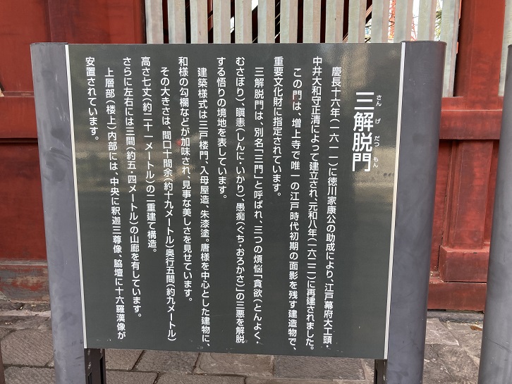慶長十六年(1611年)に徳川家康公の助成により、江戸幕府大工頭・中井大和守正清によって建立され、元和八年(1622年)に再建されました。この門は、増上寺で唯一の江戸時代初期の面影を残す建造物で、重要文化財に指定されています。三解脱門は別名「三門」と呼ばれ、三つの煩悩「貪欲(とんよく・むさぼり)、瞋恚(しんに・いかり)、愚痴(ぐち・おろかさ)」の三悪を解脱する悟りの境地を表しています。建築様式は三戸楼門、入母屋造、朱漆塗。唐様を中心とした建物に、和様の勾欄などが加味され、見事な美しさを見せています。その大きさは、間口十間余(約19メートル)・奥行五間(約9メートル)・高さ七丈(約21メートル)の二重建て構造。さらに左右には三間(約5.4メートル)の山廊を有しています。上層部(楼上)内部には、中央に釈迦三尊像、脇壇に十六羅漢像が安置されています。