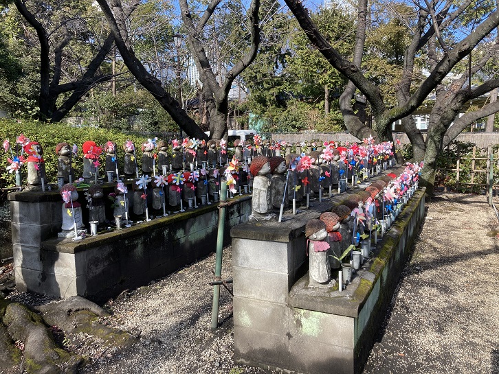 増上寺の裏手には驚くべき数の地蔵尊が立ち並んでいます。帽子・前掛け・風車は常に差し替えられ、信心の高さを物語っています。