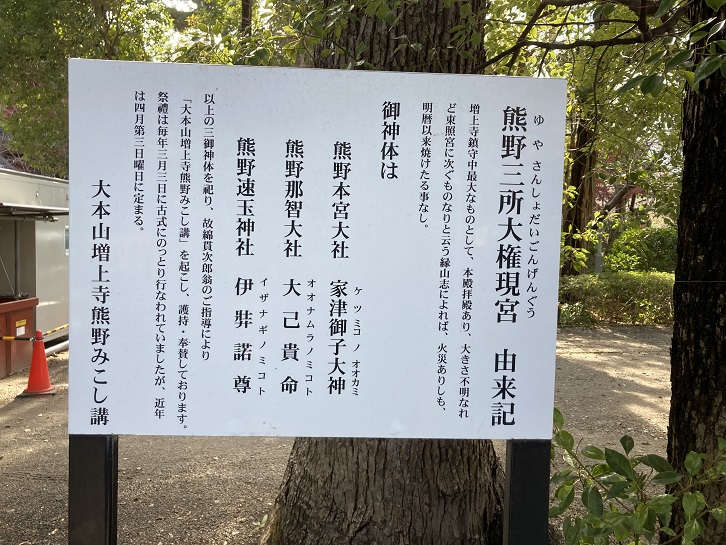 以上の三御神体を記り、故綿貫次郎翁のご指導により「大本山増上寺熊野みこし講」を起こし、護持・奉賛しております。祭禮は毎年三月三日に古式にのっとり行なわれていましたが、近年は四月第三日曜日に定まる。
