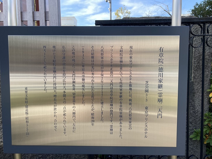 現在の東京プリンスホテル敷地には、戦前、六代将軍家宣の文昭院霊廟と並んで、七代将軍家継の有章院霊廟がありました。プリンスホテル正面の二天門は有章院霊廟の惣門です。霊廟は八代将軍吉宗が享保二年(1717年)に建立しました。その結構(全体の構造や組み立て・構成の意)は日光に劣らぬと伝わる程でしたが、昭和二十年(1945年)に東京大空襲で焼失しました。この焼け残った二天門は銅板葺・切妻造りの八脚門で、左右に仏法守護の役目を持つ広目天・多聞天の二点が祀られています。焼けた文昭院霊廟の門に持国天・増長天が置かれ、合わせて四天王として祀られていました。