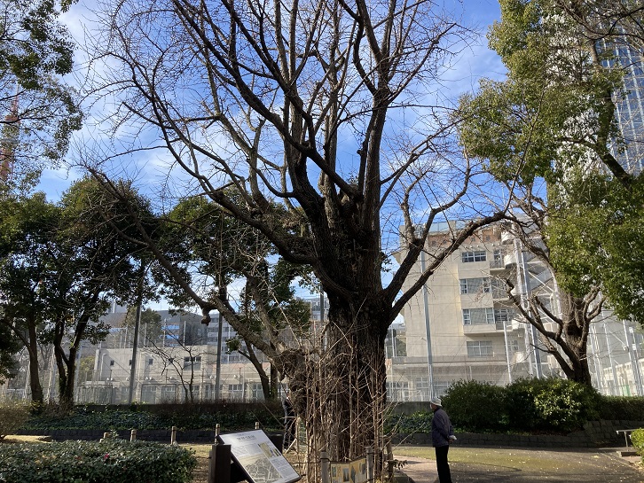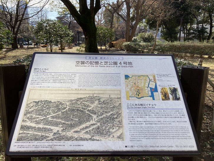 芝公園は、明治六年(1873年)に芝公園1号地−25号地に分割されました。その芝公園4号地に枯れ木のような銀杏の大木が立ち、その脇に案内板が置かれていました。