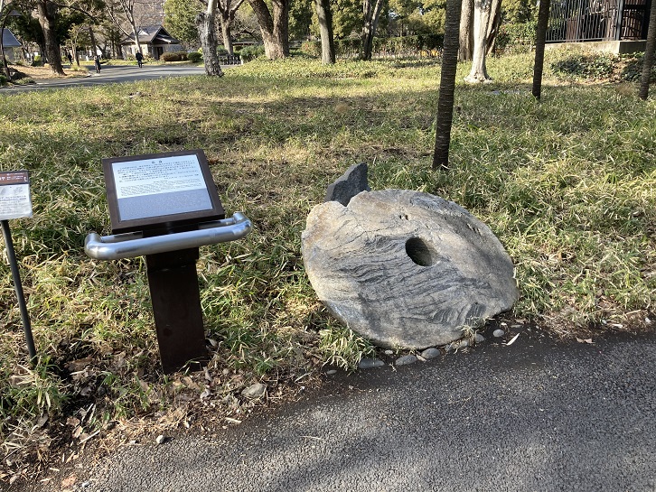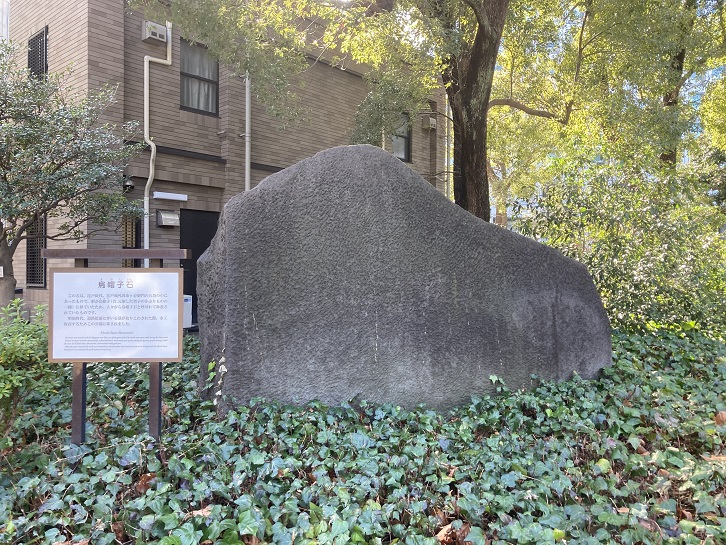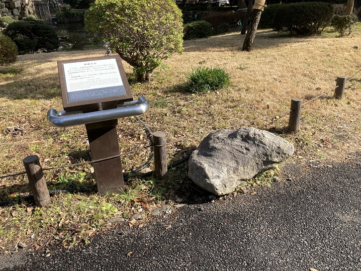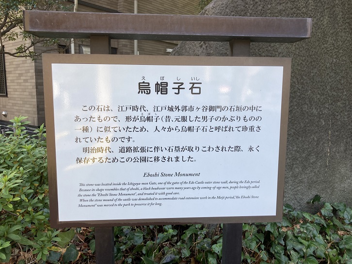 This stone was located inside the Ichigaya-mon Gate, one of the gates of the Edo Castle outer stone wall, during the Edo period. Because its shape resembles that of eboshi, a black headwear worn many years ago by coming-of-age men, people lovingly called the stone the "Eboshi Stone Monument", and treated it with good care. When the stone mound of the castle was demolished to accommodate road extension work in the Meiji period, "the Eboshi Stone Monument" was moved to the park to preserve it for long.