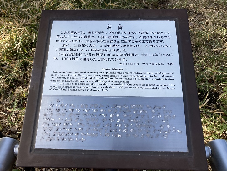 によって価値が決められました。この石貨は長径1.35m・短径1.00mのほぼ円形で、大正十三年(1924年)頃、1000円位で通用したと言われています。