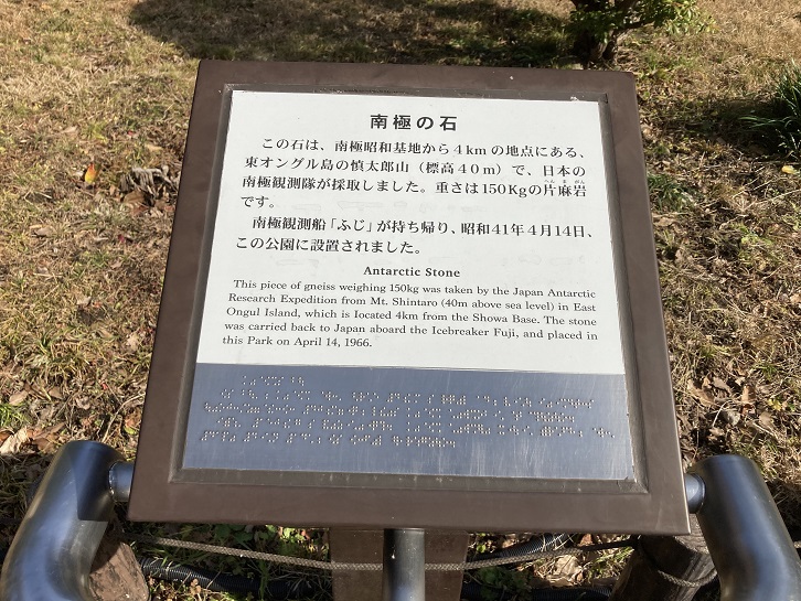 この石は、南極昭和基地から4kmの地点にある、東オングル島の慎太郎山(標高40m)で、日本の南極観測隊が採取しました。重さは150kgの片麻岩です。南極観測船「ふじ」が持ち帰り、昭和41年4月14日、この公園に設置されました。