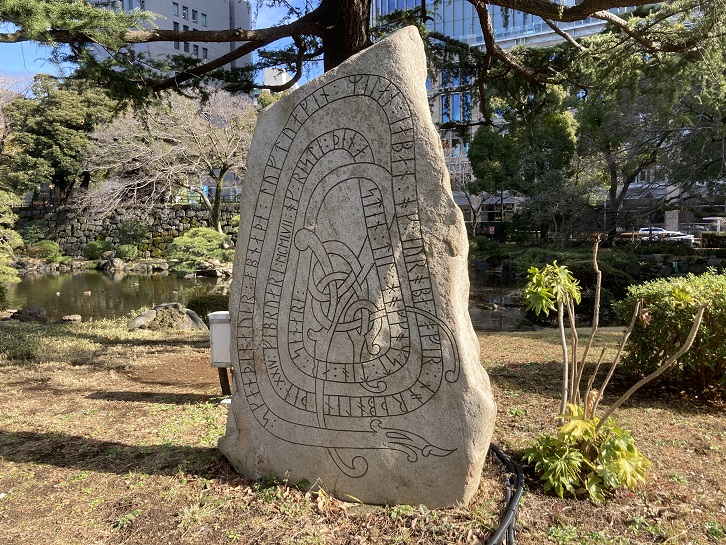 スカンジナビアの人々が1957年2月24日ヨーロッパより北極経由で日本への空路を開拓しました。この碑は北極航路開設10周年を記念して寄贈されたもので、スカンジナビアのバイキングの古代北欧文字碑を模したものです。