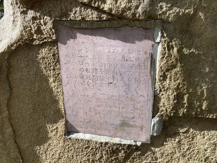 The Scandinavians explored an air route from Europe to Japan via the North Pole on February 24, 1957. This monument was given in commemoration of the tenth anniversary of the Arctic air route. It uses the ancient Nordic epitaph of the Scandinavian Vikings as a motif.