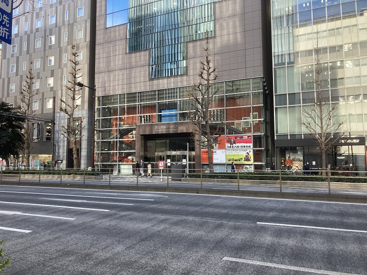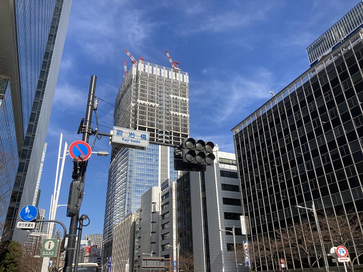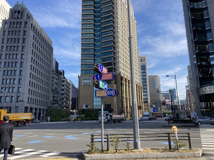 西新橋交差点で外堀通りと交差します。昔、このあたりは田村町と呼ばれていました。日比谷シティは、昭和四十八年(1973年)7月末限りで「NHK放送センター」となって渋谷区神南に移転した旧日本放送会館の跡地に昭和五十六年(1981年)に開業しました。富国生命ビル・日比谷国際ビル・日本プレスセンタービルで構成され、ショッピングモールはこれら3つのビルにまたがる地下街となっています。日比谷シティ広場「サンクンガーデン」は現在に至るまで都内で唯一の屋外イベントスペースがあるオフィス空間として存在しています。かつては冬季になるとニューヨークのロックフェラーセンターのようなスケートリンクが広場に出現し、都内では珍しくビル街にスケートリンクがありました。現在このリンクはやはり冬季に日比谷シティフットサルとして利用されています。