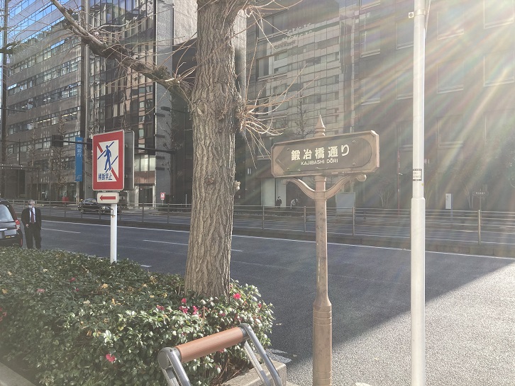 鍛冶橋通りは、皇居の二重橋前交差点から永代橋西交差点までの区間を結ぶ道路です。東京国際フォーラム(旧東京都庁)に面し、鍛冶橋通りの地下深くを東方向に京葉線が走っていて、京葉線東京駅と八丁堀駅はこの通りに面しています。江戸城外堀の外側に鍛冶屋職人が暮らしていたため鍛冶橋と名づけられたそうですが、徳川幕府の御用絵師として著名な狩野探幽もこの御門のほぼ正面に屋敷を構えていたそうです。