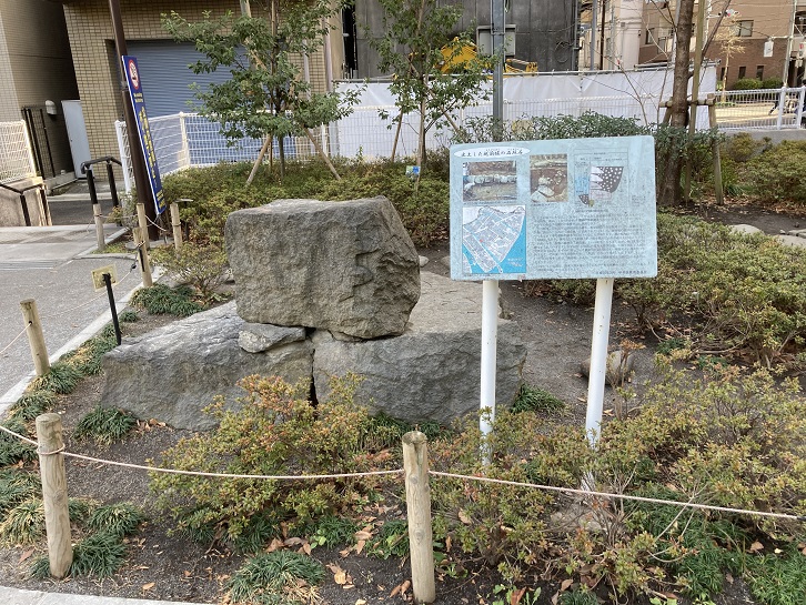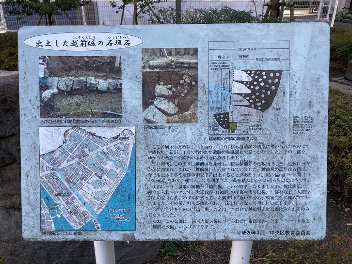 新川に入ると、交差点の角のビルに「越前堀薬局」と表示されています。越前堀?ひょっとして昔の掘割の名前かと思って地図を見ますと、近くに越前堀の名前が付いた公園があるみたいです。早速行ってみます。すると、公園の中に大きな石を積んだモニュメントと案内板があります。