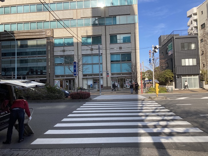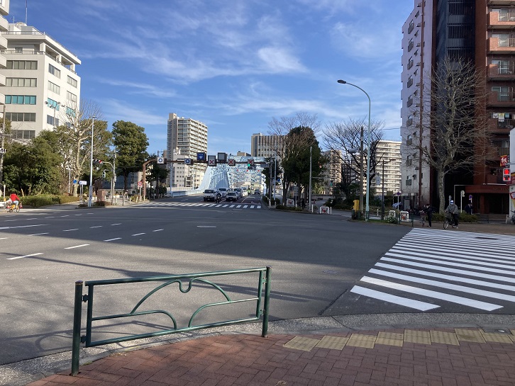 永代橋西交差点までやってきました。永代通りにも都電は走っていましたので、恐らくこの辺りで線路が合流していたのでしょうけど、今となってはその痕跡を見いだすことはできません。私的には、永代橋西交差点の手前辺りを都電5系統の終点にしたいと思います。