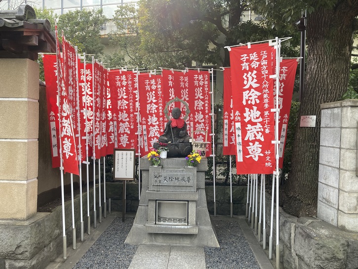 妙定院の隣りに小さな地蔵尊が祀られています。妙定院の開創当時から境内に地蔵堂があり、木造寄木造丈六金箔置の大地蔵尊坐像が安置されていました。相貌は崇高な中にも温容慈光が参詣者の心を打ち、延命子育・利益広大と言い伝えられてきました。のち、「江戸南方四十八所地蔵尊参」(寛政六年(1794年)撰)の第二十七番に列せられ、多くの参拝者でにぎわいました。昭和二十年(1945年)の東京大空襲で消失しましたが、惜しむ声多く、唯一残った守護札版木をもととして石像で再建され、霊験あらたかと親しまれています。