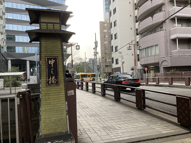 赤羽橋の次に中ノ橋が古川に架かっています。昭和六十年に架け替えられたのだそうですが、古風な親柱は以前の橋のものを保存しているのでしょうか?「中ノ橋」の橋名は、赤羽橋と一之橋の間に架かっていたのでこの名前になったといわれています。