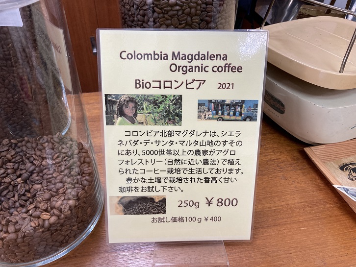 店内を見ますと先客のあばさんが長々とお店の方と話しています。店内には一組しか入れませんので、暫し外で待ちます。ようやっとおばさんが出てきたので、お店の中に入ります。いつもコーヒーを買っているカルディとは大分雰囲気が違います。看板に出ていた珈琲を買おうとしたら、先ほどのおばさんが買い込んでもう今月分は売り切れになったのだとか。代わりにコロンビアの珈琲を勧められました。こちらも良さげです。注文すると2階の焙煎室から出来たてのコーヒー豆を持ってきてくれました。帰ったら早速飲んでみましょう。