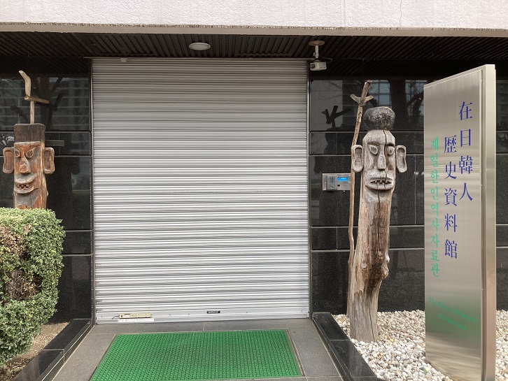 道路に面してトーテムポールのような木造彫刻が2体並んで立っています。何のおまじないかと思っていたら、在日韓人歴史資料館の入口のようです。