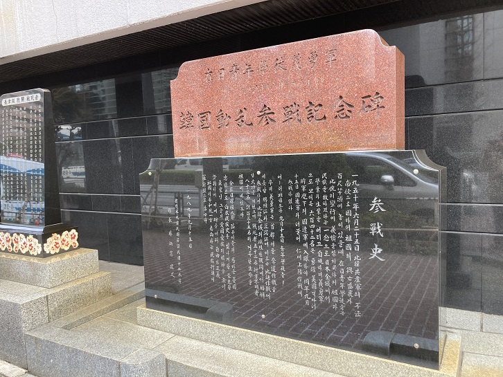 資料館の前には黒光りする石碑が置かれています。漢字を拾い読みしますと、どうやら朝鮮動乱時の在日青年学校義勇軍を讃えた韓国動乱参戦記念碑と忠魂碑みたいです。ハングル文字で文章の意味は分りませんが、朝鮮語って漢字も使うんですね。