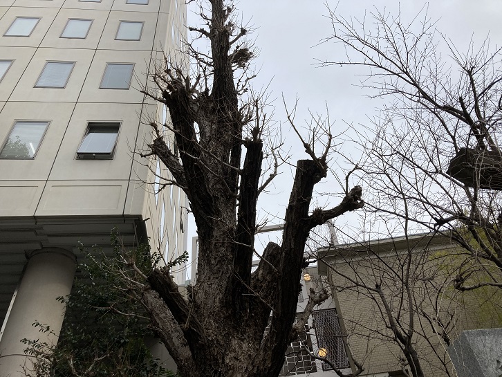 雉子神社の狭い境内にはイチョウの老木があります。枝を落としているのはちょっと可哀想ですね。