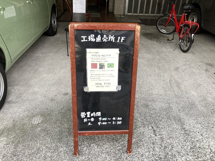 新一の橋交差点の直ぐ脇にコーヒーの専門店があります。1階が直売所になっていて、2階が工場(焙煎室)になっているようです。店先に立ててあった「今月のオススメ珈琲 ブラジル・モジアナ」に惹かれます。私は初めて目にしましたが、モジアナ地区は世界最大のコーヒー大国ブラジルの中でも特に上質なコーヒーが採れる産地として有名らしいです。