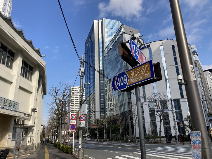 日比谷通りが環状二号線と交差するところから虎ノ門ヒルズが眺められます。虎ノ門一帯には超高層ビルが続々と建てられていて、これから街の景観は一変することでしょう。