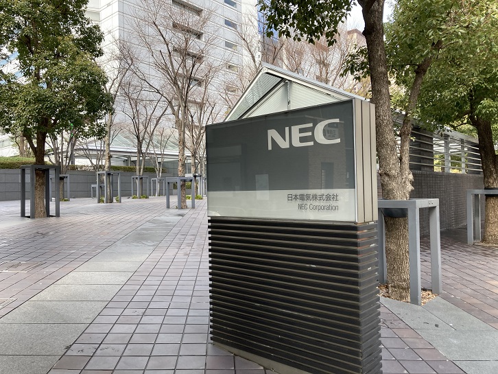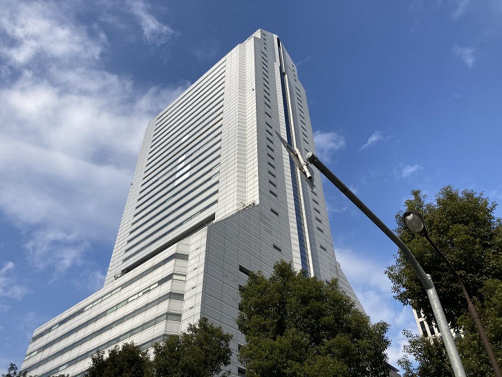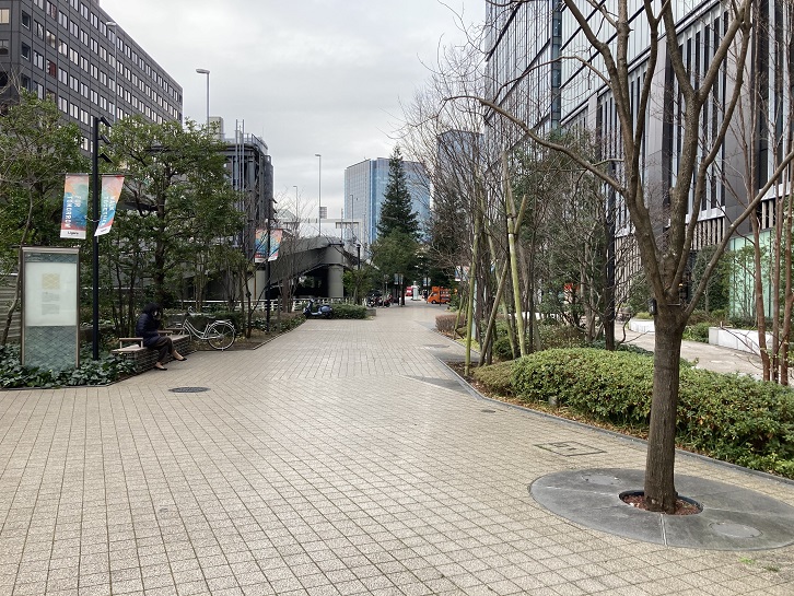 歩き始めると前方に特徴ある巨大なビルが目に飛び込んできます。NEC(日本電気)本社ビルです。平成二年(1990年)に完成した、高さ180メートル・地上43階・地下4階の高層ビルです。最大の特徴は、「風穴(ウインドアベニュー)」と呼ばれる巨大な開口部がビルの中層階に設けられていることで、建物周辺に吹き降ろしのビル風による風害を生じないように風下に風を逃す風穴としての役割を担っています。