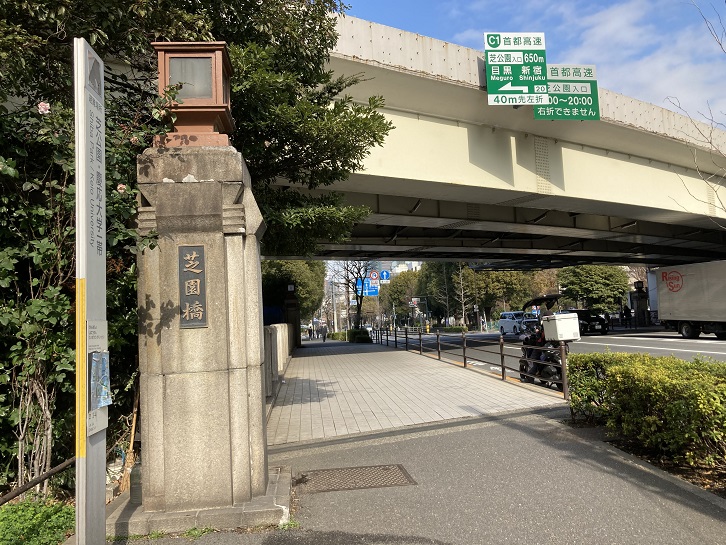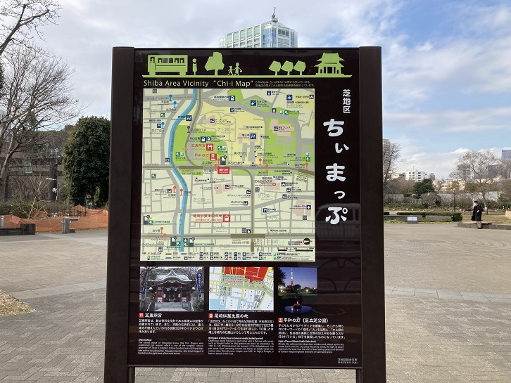芝園橋の先に芝公園の敷地が拡がっています。公園の中に港区の「ちぃまっぷ」が立っています。