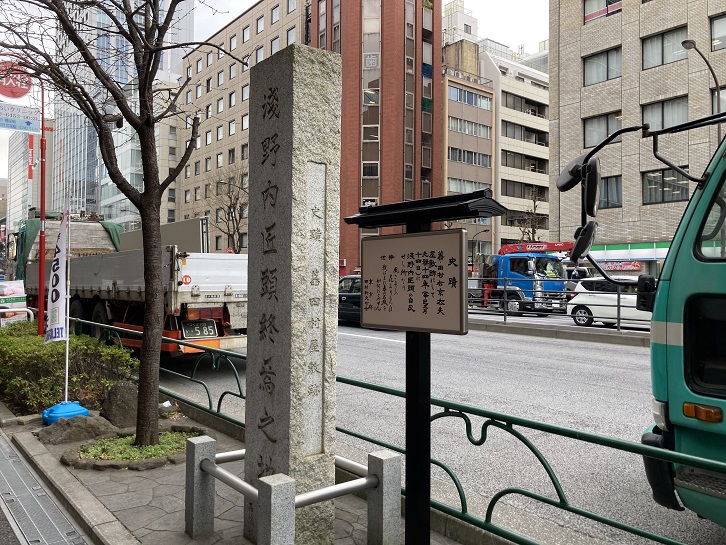 新橋四丁目交差点付近に「浅野内匠頭終焉之地」と彫られた石碑が立っています。江戸時代、この辺りは奥州一之関藩(岩手県)田村右京太夫の上屋敷がありました。内匠頭は江戸城松の廊下での刃傷沙汰があったその日の16時頃にこの屋敷に送られました。その1時間後 幕府の正検使役として庄田安利らが田村邸に到着し、出会いの間にて浅野内匠頭に切腹と改易を宣告します。浅野内匠頭が田村邸の庭先で切腹したのは刃傷事件のわずか7時間後のことでした。上野介を打ち取れなかった無念の思いを、辞世の句「風さそう花よりもなほ我はまた春の名残をいかにとやせん」に託しています。