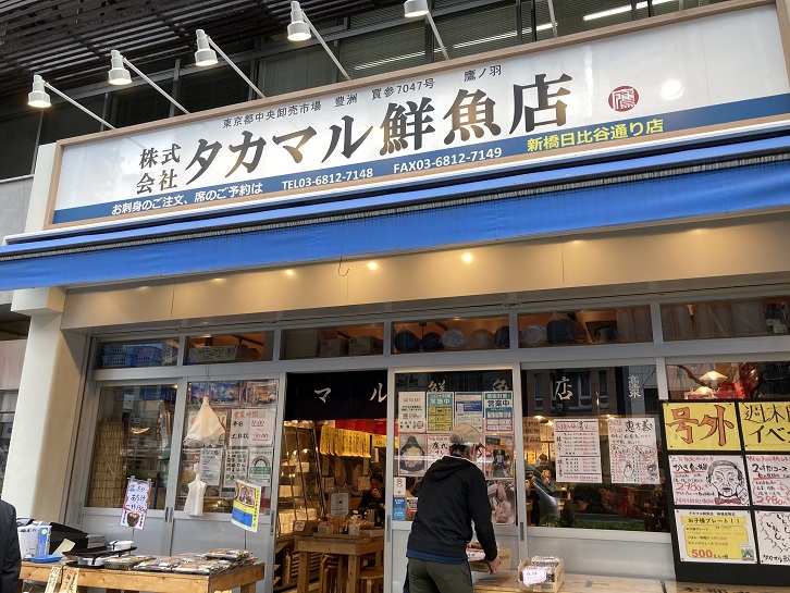 西新橋交差点の手前でド派手な装飾の海鮮居酒屋さんを見つけました。新宿の小滝橋通りで見かけたタカマル鮮魚店の系列のお店のようです。表から見たお店の造りがそっくりです。鮮魚も売っているとのことですが、店先にはお弁当やお握りや魚の惣菜が山盛りになって並べられています。「タカマル鮮魚店」を運営しているのは豊洲市場のまぐろの解体師だそうです。魚市場のことを知り尽くしているからこそ、高級鮮魚を卸売市場内の仲卸業者価格で提供できるのだとか。毎朝、豊洲で仕入れてきた魚介類を刺身・寿司・煮魚・焼き魚などさまざまなかたちで味わうことができます。お得なランチはもちろんのこと、日本酒や焼酎も30種類以上置いていて、なかでも秋田の銘酒「高清水」は樽酒で楽しめるので夜も周辺のオフィスのサラリーマンなどで大変賑わってみたいです。人気のメニューは「タカマル定食」で、ふたつの桶にそれぞれごはんと山盛りの刺身がドンと盛られて登場します。刺身の内容は日替わりでその時々の旬の魚介類を使用していますが、その新鮮さとひとつひとつの分厚さに驚く人も続出しているのだとか。これにあら汁までついて千円位というお値段です。昼も夜もとにかくボリューム満点で、「うにとイクラの巻物」などはもはや「ここは北海道か」と思わせる大盛りです。昼間っからお酒が飲めるので、ランチのサラリーマン諸氏の羨望の視線を気にしつつも昼飲みできます。