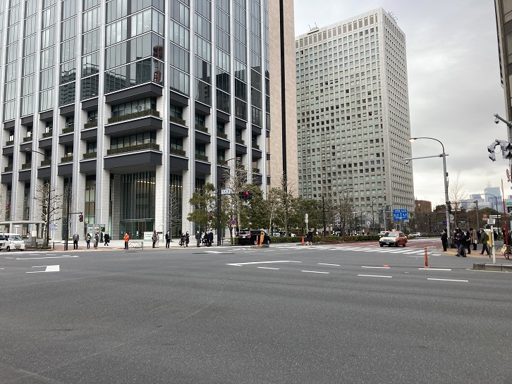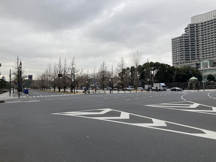 和田倉門交差点にやってきました。東京駅丸の内中央口から皇居前内堀通りまでを結び和田倉門交差点で日比谷通りと十文字に交差する道路は、天皇が行幸するため東京駅までの移動に利用した道路であるところから行幸通り(「ぎょうこうどおり」または「みゆきどおり」)と呼ばれています。和田倉門交差点から東京駅前の東京駅中央口交差点までの区間は、正式には東京都道404号皇居前東京停車場線と呼ばれる特例都道となっています。幅員約74mというこの都道の内側の車線はふだん通行止めになっていますが、皇室行事と外国大使の信任状捧呈式の馬車列が東京駅がら皇居に向かうときだけ使われています。