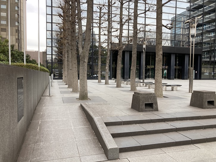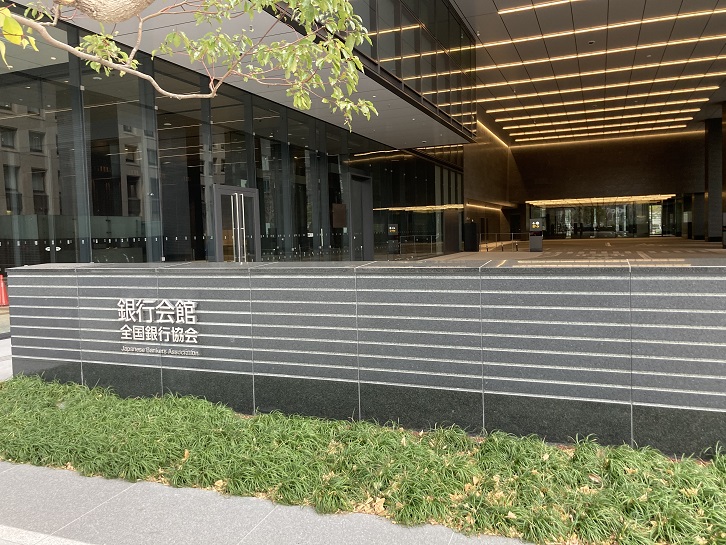 和田倉噴水公園に繋がる和田倉橋の先に、最近建て替えられた銀行会館のビルがあります。ビル前の植樹スペースに設置された石碑の上にプレートが置かれています。前回の建て替えから30年も経っていないんですね。