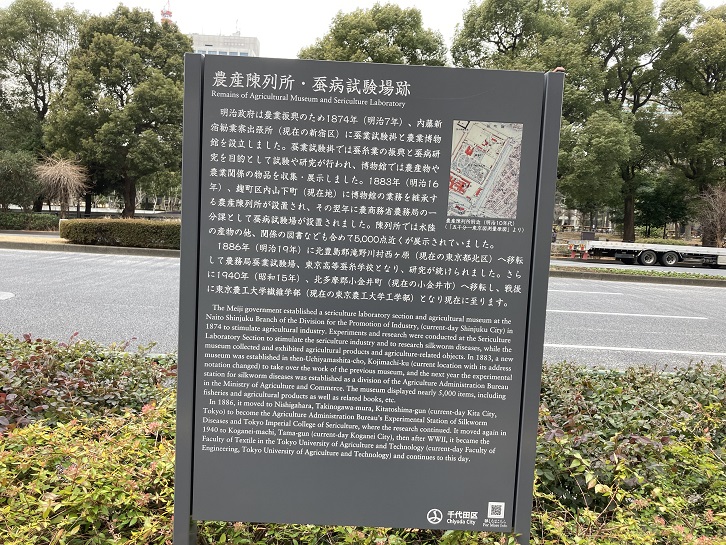 明治政府は農業振興のため明治七年(1874年)、内藤新宿勧業察出張所(現在の新宿区)に蚕業試験掛と農業博物館を設立しました。蚕業試験掛では蚕糸業の振興と蚕病研究を目的として試験や研究が行われ、博物館では農産物や農業関係の物品を収集・展示しました。明治十六年(1883年)、麹町区内山下町(現在地)に博物館の業務を継承する農産陳列所が設置され、その翌年に農商務省農務局の一分課として蚕病試験場が設置されました。陳列所では水陸の産物の他、関係の図書なども合めて5,000点近くが展示されていました。明治十九年(1886年)に北豊島郡滝野川村西ケ原(現在の東京都北区)へ移転して農務局蚕業試験場・東京高等蚕糸学校となり、研究が続けられました。さらに昭和十五年(1940年)、北多摩郡小金井町(現在の小金井市)へ移転し、戦後に東京農工大学繊維学部(現在の東京農工大学工学部)となり現在に至ります。