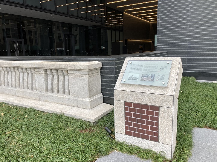 Tokyo Bankers' Association (Tokyo Ginko Shukaisho) was a Neo-Renaissance style building (1st basement / 3rd floor, brick construction) with the image of a Victorian Country House in the United Kingdom designed by Yokogawa Engineering Office completed in 1916 (Taisho 5). In 1993 (Heisei 5), it was rebuilt as a building of the Tokyo Bankers Association Building. At that time, the exterior of the west surface was partially reproduced by reusing the original materials, and the exterior of the south surface was designed in harmony with the west surface. In this rebuilding (completed in 2020), the original location of the Tokyo Bankers' Association (Tokyo Ginko Shukaisho) was shown on the exterior pavement, and we saved and exhibited a part of the stone used for the handrail on the second floor of the west side and part of the dark red tiles of the Tokyo Bankers Association Building.