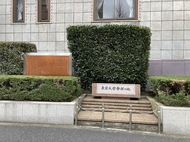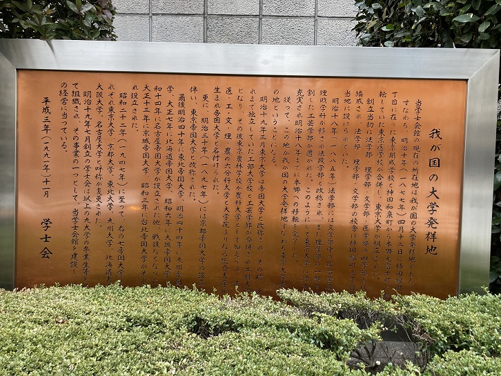 学士会館の脇に「我が国の大学発祥地」と書かれた石碑と、いわれを説明した巨大なプレートが置かれています。