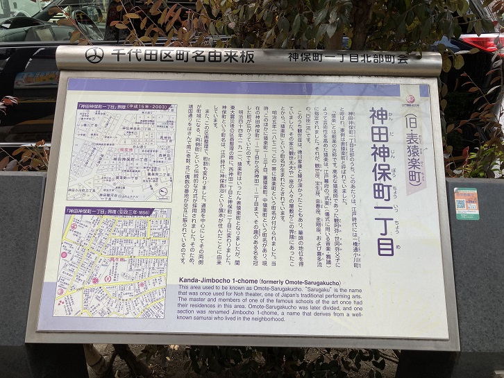 This area used to be known as Omote-Sarugakucho. "Sarugaku" is the name that was once used for Noh theater, one of Japan's traditional performing arts. The master and members of one of the famous schools of the art once had their residences in this area. Omote-Sarugakucho was later divided, and one section was renamed Jimbocho 1-chome, a name that derives from a well-known samurai who lived in the neighborhood.