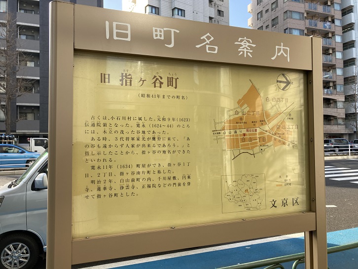 都電2系統電停にもあった指ケ谷町の町名は、現在では白山一丁目〜五丁目(三丁目は除く)になっています。家光の話はウソっぽいですね。