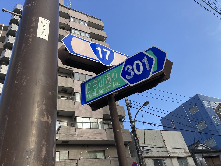 白山通りは、白山下交差点で白山通りと旧白山通りに分岐します。旧白山通りは昭和五十九年(1984年)までは白山通りでしたが、現在の白山通りが名称を引き継いだために、白山下交差点から千石駅前交差点までの区間は旧白山通りと名称変更になりました。