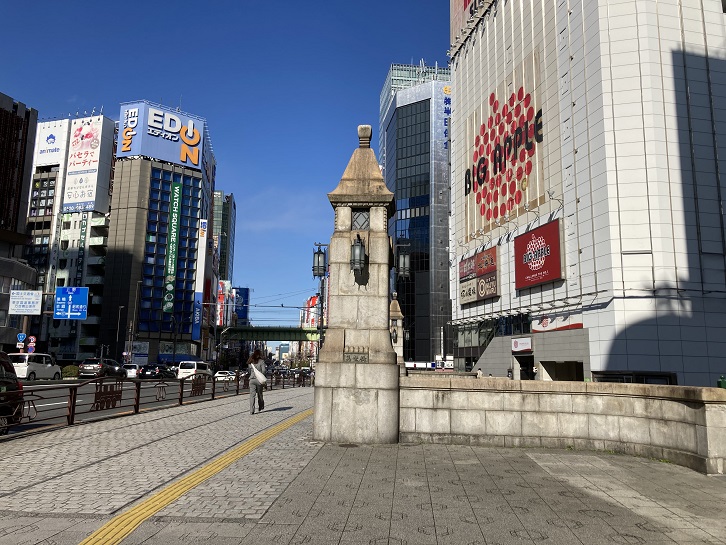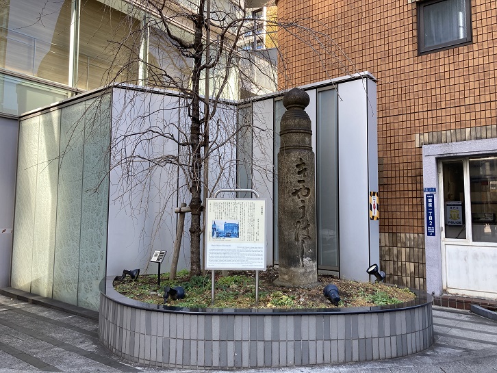 京橋は、かって江戸城の外濠(現在の西銀座ジャンクション付近)から楓川・桜川の合流地点(現在の京橋ジャンクション付近)までを流れていた京橋川に架かっていた橋です。現在は埋め立てられた京橋川の跡地に東京高速道路が高架で通っていますが、銀座通りと交差する地点に京橋の親柱が3体保存展示されています。2体は銀座通りの東側、1体は西側に置かれています。この日は西側の歩道を歩きました。親柱の横に案内板が立っています。