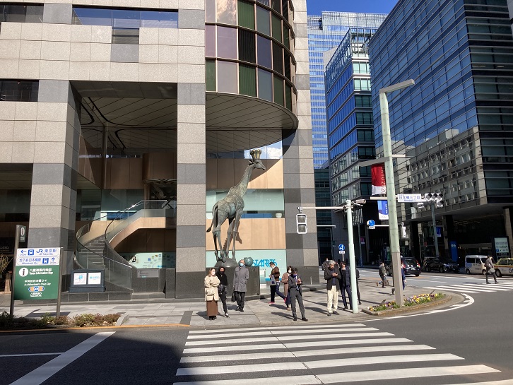日本橋三丁目交差点の角のビルの一画に大きなキリンの銅像が立っています。このビルは元々は漢方薬やバスクリンで有名な津村順天堂のビルでしたが、2006年に社屋を移転し、現在はスターツコーポレーション株式会社の本社になっています。昭和六十三年(1988年)に今のビルに建て替えられ、翌年に高さ6m25cmのキリンの銅像が設置されました。作者は鍛金彫刻家の安藤泉氏です。表情や佇まいがとても穏やかに見える大きなキリンの銅像ですが、何故こんなに大きなキリンの銅像をここに設置したのでしょうか?その理由は3つあるそうです。一つ目は、1976年に津村順天堂の漢方薬が保険医薬品に認定され、テレビCMによってバスクリンが成功するなど業績が好調だったことです。二つ目は、このキリンが王冠を被っているように、キリンは漢方の王様と言われていたことです。三つ目は、このビルの吹き抜けの天井を王冠にある照明器具で照らすために高さが必要だったことです。社屋移転の際にキリンの像も一緒に連れていくことは出来なかったのでしょうか?