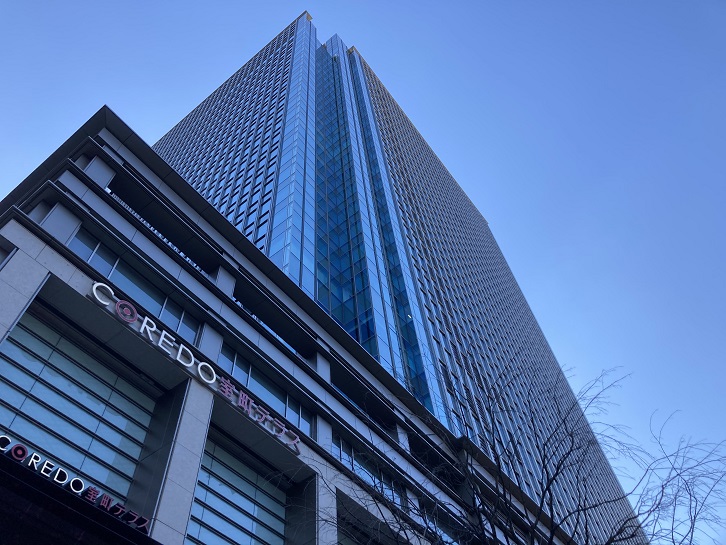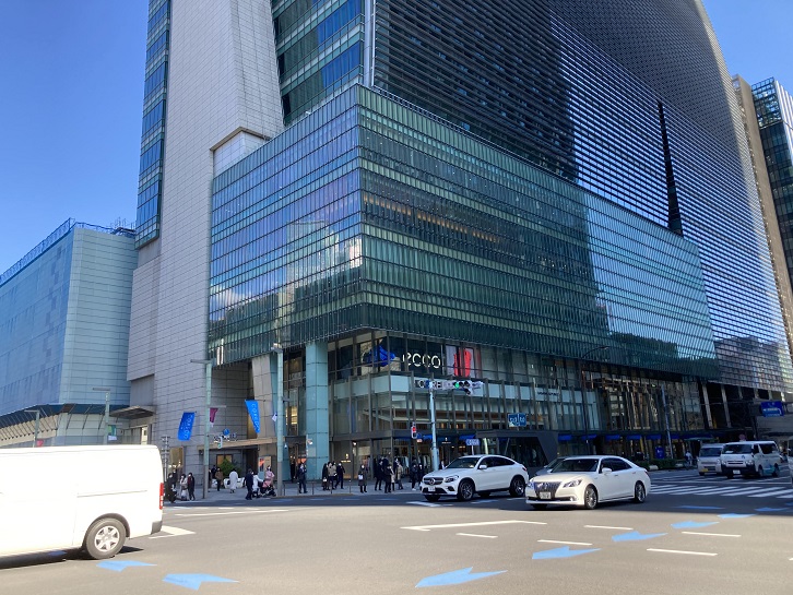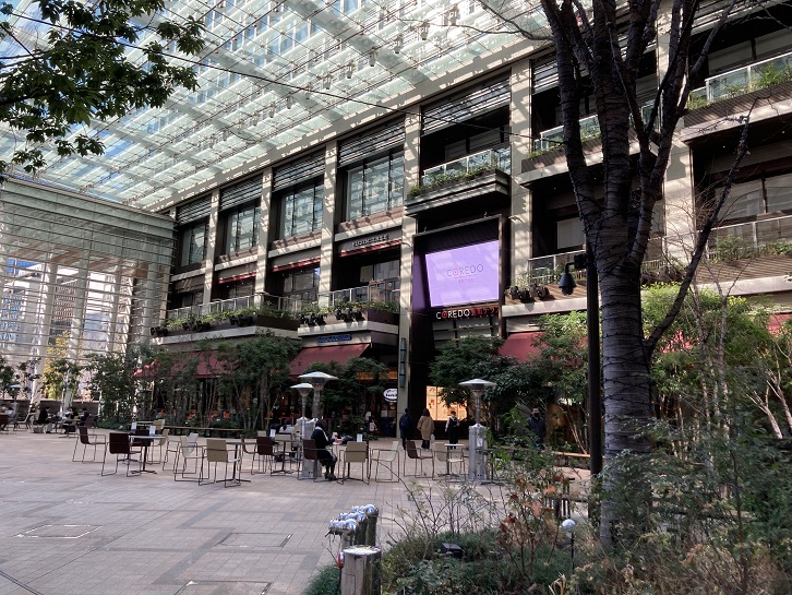 三井タワーの隣の区画で建設中だった巨大高層ビルはCOREDO室町テラスとしてオープンしました。正面入口が中央通りに面しておらず、脇道にあるのが特徴です。入口広場はテラスになっていて、天井は全体がガラスの屋根で覆われています。テラスにはバルコニーも面していて、ちょっとした南欧風の外観になっています。