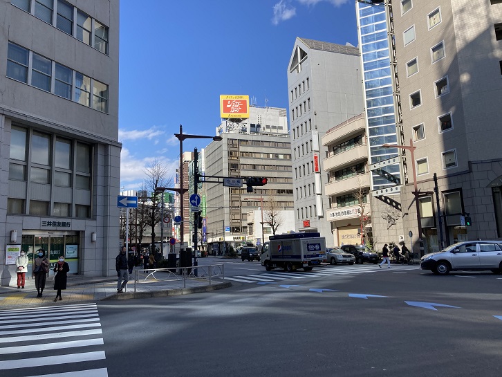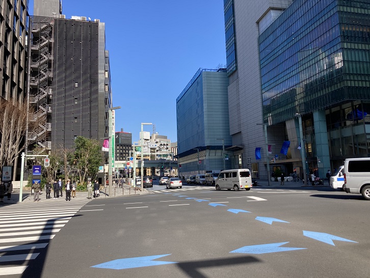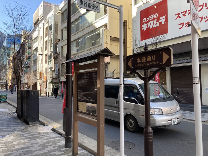 室町四丁目交差点で中央通りと交差している脇道が本銀通リです。これを正しく読める人は希でしょう。