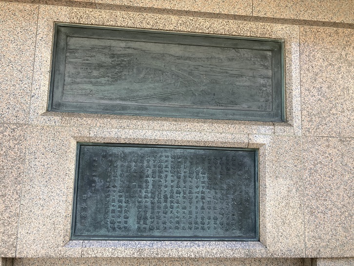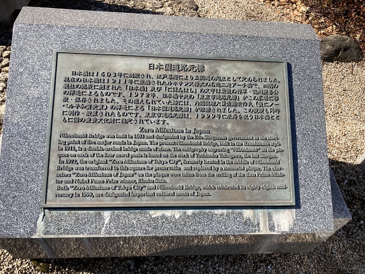 元標の広場には「日本国道路元標」のレプリカが置かれていて、隣りにそれを解説した石碑があります。