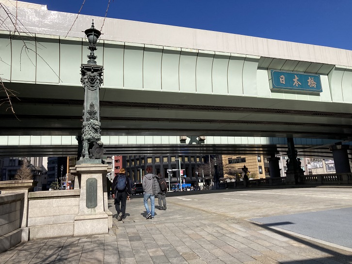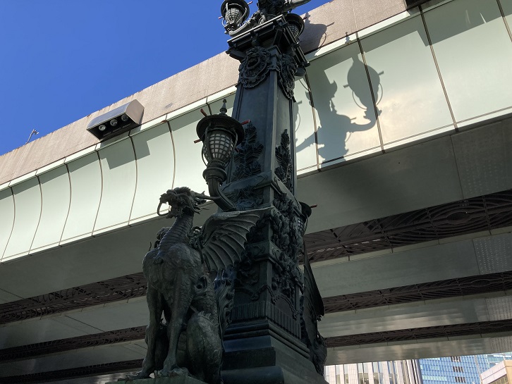 日本橋の欄干には獅子をモチーフにした立派なブロンズ像が照明灯と共に君臨しています。今は機能一辺倒でこのような装飾はされませんが、昔の人は美的感覚があったんでしょうね。