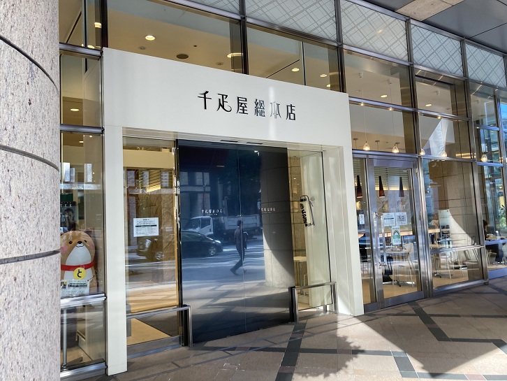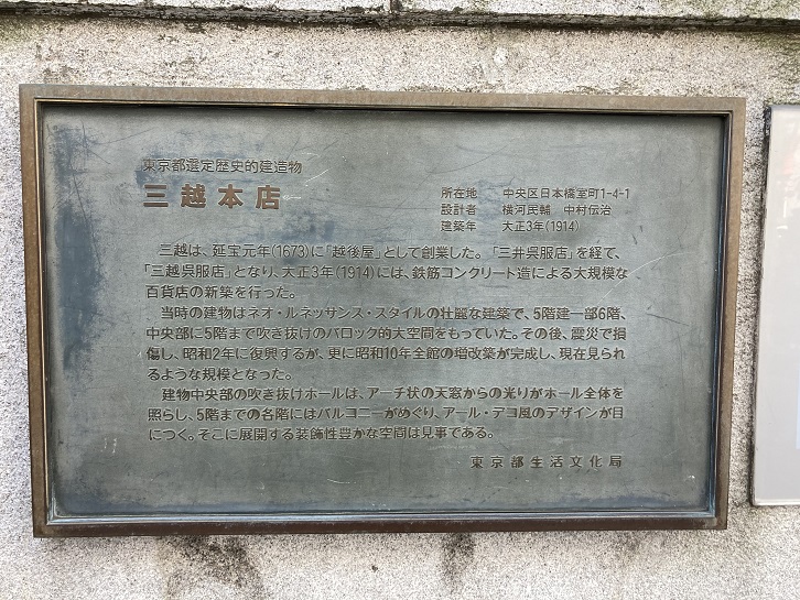 日本橋を渡った先に三越本店の巨大な建物があります。正面から見ると船の舳先のようです。入口の両側には三越の象徴であるライオンのブロンズ像が置かれています。銀座三越のライオン像には三越のロゴが入った特製のマスクが付けられていますが、本店のライオン像はノーマスクです。ライオン像の台座に三越の由来を記したプレートが埋込まれています。